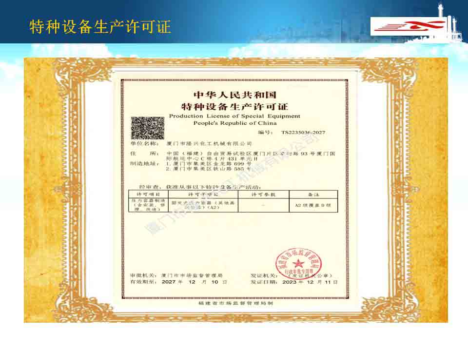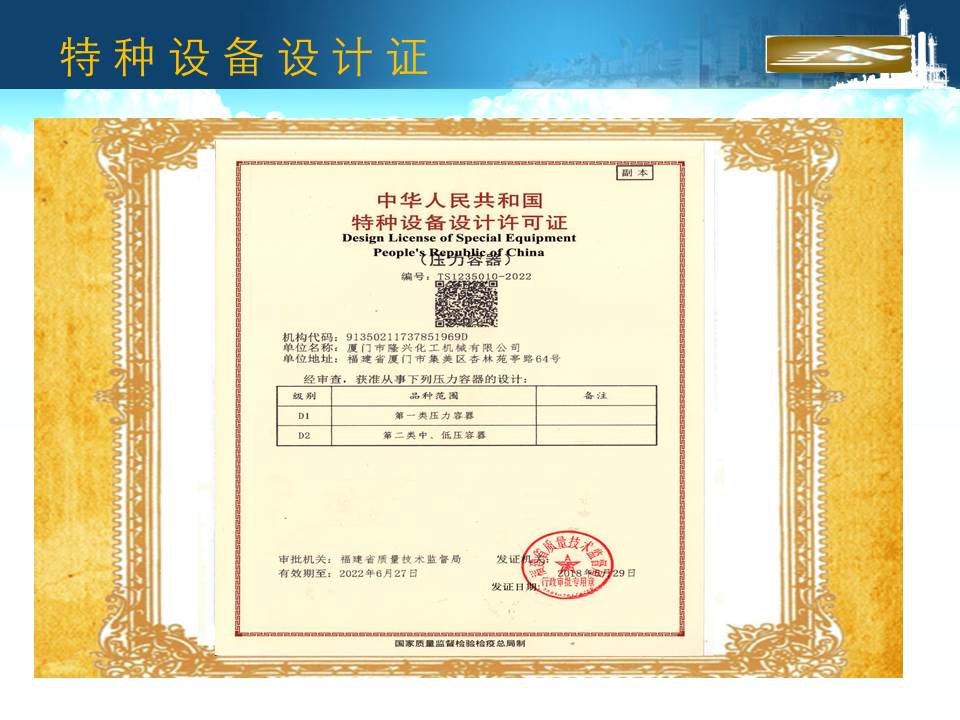 廈門隆興化工機(jī)械有限公司成立于2001年5月,占地面積30000平方米,擁有生產(chǎn)車間面積10000平方米及相關(guān)配套的辦公場(chǎng)所3000平方米,其中下料場(chǎng)所1000平方米,不銹鋼制作場(chǎng)所2000平方米,ASME產(chǎn)品制作區(qū)域1200平方米,無(wú)損曝光室30平方米。公司有職工135人,擁有專業(yè)的技術(shù)人員和管理人員36人。公司主要從事設(shè)計(jì)、制造A2級(jí)覆蓋D類壓力容器...