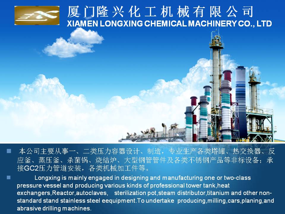 廈門隆興化工機(jī)械有限公司成立于2001年5月,占地面積30000平方米,擁有生產(chǎn)車間面積10000平方米及相關(guān)配套的辦公場(chǎng)所3000平方米,其中下料場(chǎng)所1000平方米,不銹鋼制作場(chǎng)所2000平方米,ASME產(chǎn)品制作區(qū)域1200平方米,無(wú)損曝光室30平方米。公司有職工135人,擁有專業(yè)的技術(shù)人員和管理人員36人。公司主要從事設(shè)計(jì)、制造A2級(jí)覆蓋D類壓力容器...